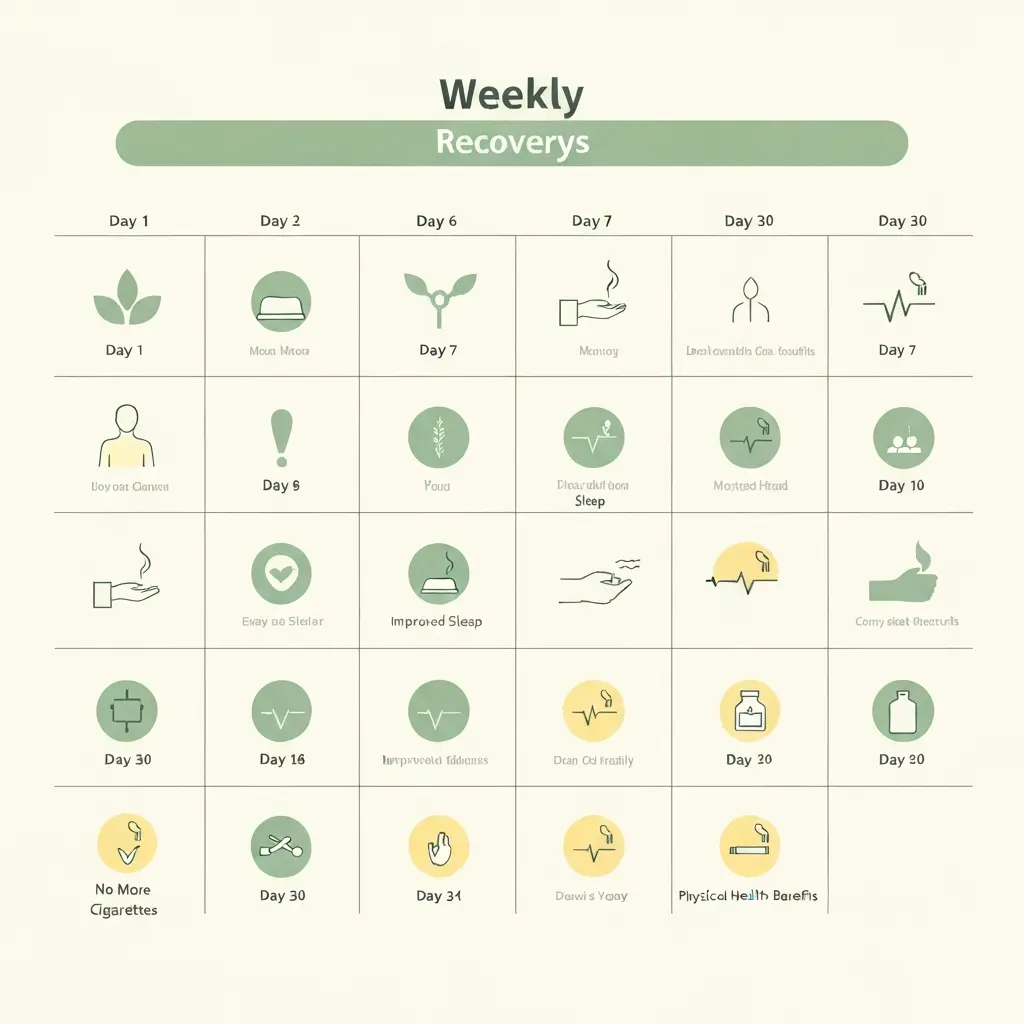 After week one, nicotine is fully cleared from the body and the worst physical withdrawal is behind you. Weeks 2–4 focus on managing psychological triggers and building new habits. By one month, lung function improves noticeably. At three months, circulation and breathing capacity see significant gains. Each subsequent month brings measurable health benefits that compound over time.